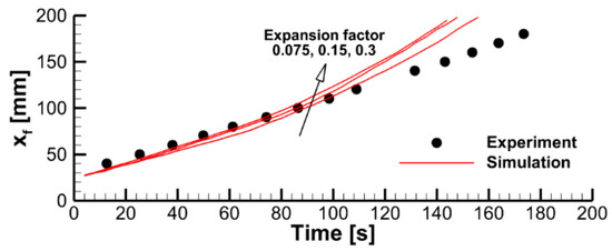 corresponding to the given expansion factor. The char porosity strongly affects thermal properties (particularly the thermal conductivity) of the degrading material, which is evaluated as explained in Ref. [2]. Due to this, the simulation results appeared to be sensitive to the expansion factor pre-assumed in the simulations. Unless otherwise stated, we assume = 0.15 to allow for the significant shrinkage of the degrading material clearly observed in the experiment. To explore the effects incurred by these model parameters, the values of 0.075 and 0.3 have also been explored. Steady downward flame propagation was not predicted with the expansion factor above unity, i.e., in case if the material was assumed intumescent.