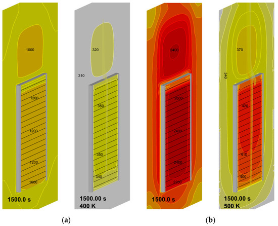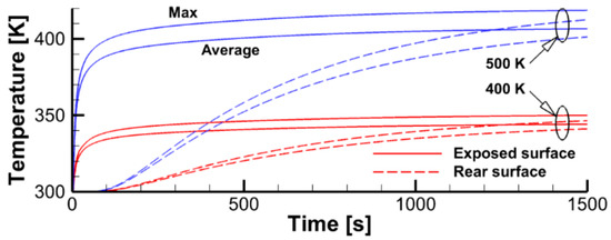 The computational domain shown in Figure 4 does not replicate the geometry of the heater (radiative panel) used in the experiment. Furthermore, the problem setup assumes a uniform temperature distribution over the radiating surface, thereby ignoring the non-uniformity of the temperature distribution over the real panel. Therefore, to provide the surface incident radiation in accordance with the above estimates (about 2 kW/m2, as derived from the requirement to maintain the steady-state temperature of the exposed specimen surface close to 350 K), the effective surface temperature of the heater should be selected. The calculated dependence of the surface incident radiation at the exposed specimen surface on the heater temperatures is demonstrated in Figure 8, which shows that heater temperatures of 450–470 K cause this requirement to obey for either the maximum or surface-averaged value of the incident radiative flux at the sample surface.