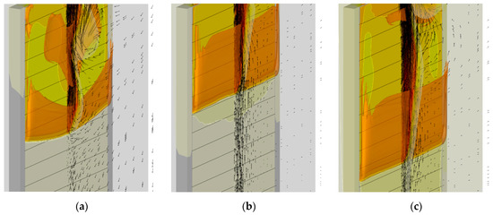 In view of the above arguments, the mesh refinement was undertaken in the region where the gaseous flame edge propagates over the surface. The meshes are demonstrated in Figure 5, which shows the vertical cross-section of the computational domain including the gas, the burning specimen, and the plasterboard substrate behind the specimen (the mesh is only shown in the gas region). The first mesh (Figure 5a) is the basic one described above. In the second mesh (Figure 5b), the near-sample region (up to 1 cm away from the exposed sample surface) is refined by splitting each cell of the basic mesh by two equal cells in each direction, thereby reducing the cell volume in this region by a factor of eight. In the third mesh, further halving of the cells (in three directions) is undertaken in the region near the sample surface up to 0.6 cm away from the surface (Figure 5c). The total amount of the cells in these meshes was 750732, 1177116, and 2893944, respectively.