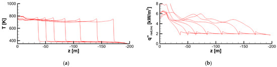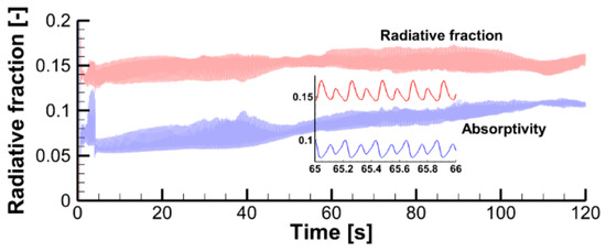 The convective heat transfer coefficient, , can be estimated by the empirical correlation for the free convection near a vertical slab, and it is expected to be about 10–20 W/(m2·K). Using these values and applying Equation (2), we obtain = 1994 to 2078 W/m2 for the surface incident radiation at the exposed specimen surface. Using (3), we measure the specimen surface emissivity, , to be in the range from 0.6 to 0.9.