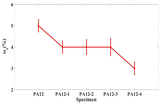 Figure 2 shows the seawater absorption of composite specimens after immersing them for 24 h. It could be seen that the seawater absorption of the PA12 matrix composites was higher than that of the nanometer SiC and SiO2 particle-reinforced PA12 composites. The seawater absorption of the PA and PA12-1 were 5% and 4%, respectively. It demonstrates that adding macron SiC could decrease the seawater absorption of the composites. In contrast, the addition of micro with a lesser proportion and nanometer could reach the same effects. The printing of recycled powder does not affect the seawater absorption rate. The addition of nano-SiO2 can further decrease the adsorption to 3%; this might be because the particles filled the gaps in both the surface and bulk of composite specimens in the third printing progress. The seawater absorption of composites obviously decreased with the addition of micro and nanoparticles.