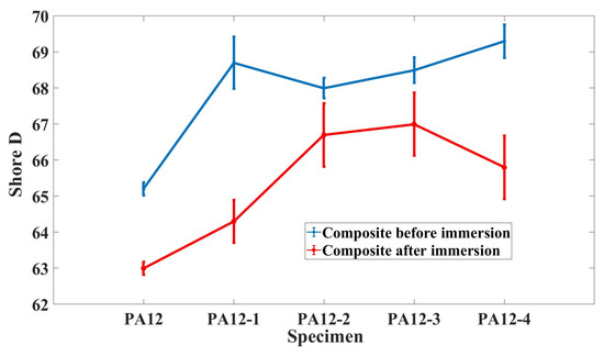 Figure 3 demonstrates the hardness (Shore D) change of composite specimens before and after immersion. As shown in Figure 3, the hardness (Shore D) of the PA12 was far below that of the filled PA12 composites (PA12-2, PA12-3, PA12-4). The hardness (Shore D) of the filled PA12 composite specimens increased greatly both before and after immersion. The addition of nanometer SiC makes the hardness of PA12-2 and PA12-3 decrease slightly under dry conditions. In the seawater environment, adding SiO2 nanoparticles could decrease the hardness of the composites. The change of hardness (Shore D) before and after immersion of the PA12-1 was relatively higher than in other cases.