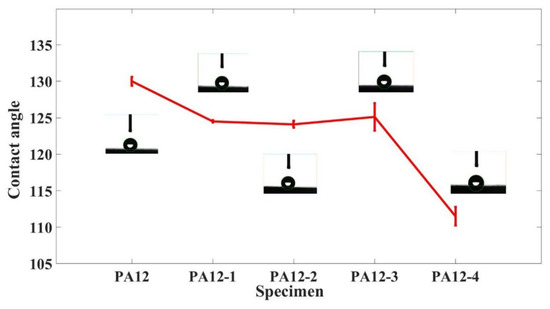 Figure 5 shows the contact angle of PA and its composite specimens (PA12-1, PA12-2, PA12-3, PA12-4) with seawater. The contact angle of composite specimens varies between 110 and 130 degrees, which indicates that they have hydrophobic properties. The contact angle of the PA12 matrix specimen is higher than that of the composite specimens. The contact angle of the composite decreases with the addition of micron- and nano-SiC particles, and further decreases greatly with the addition of nanometer SiO2. The main reason for this is that the addition of the micro and nanoparticle increases the degree of aggregation of particles and decreases the proportion of space on the surface. It is noted that the contact angle of PA12-2 and PA12-3 only has a slight change.
