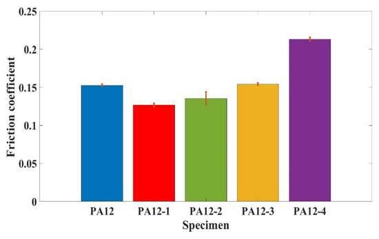 PA12 has good mechanical properties, low water absorption, a low relative density and melting point and low quality due to its chemical structure characteristic [8]. PA12 is one of the important materials used in the selective laser sintering process, and PA12 and PA12 matrix composites are the most common ones. Daniel B. Roppenecker [9] investigated the influence factors of friction coefficients for selective laser sintering, finding that the anisotropic material behavior, contact pressure, contact areas and intensive finishing treatment significantly affects the friction coefficient of the sample. Andreas [10] also studied the tribological anisotropy of selective laser-sintered PA12 components. The results show that the longest running-in-phase and lowest wear was found in the layer orientation parallel to the load direction, whereas a orientation leads to a longer running-in-phase as higher wear at a . Saleh [11] evaluated the three different orientations’ (X, Y, Z) effects on the tribological behaviors of laser-sintered PA12. The experimental results revealed that under dry conditions, the friction coefficient, and the specific wear rate of PA12 specimens oriented along X and Z axes, are significantly larger than when oriented along the Y-axis. In addition to the study of PA12 selective laser sintering samples, PA12 matrix composites selective laser sintering samples are also studied.