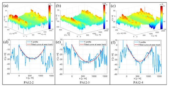 The worn surfaces of PA12-2, PA12-3 and PA12-4 specimens. (a–c) At 3D view and (d–f) Y profiles with fitted curves.