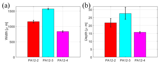 The width wear track dimensions of the PA12-2, PA12-3 and PA12-4 specimens. (a) Width, (b) Depth.