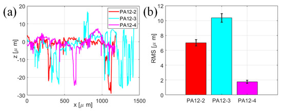 The analysis of selected profiles at the wear tracks of the PA12-2, PA12-3 and PA12-4 specimens. (a) Leveled profiles (b) RMS roughnesses.