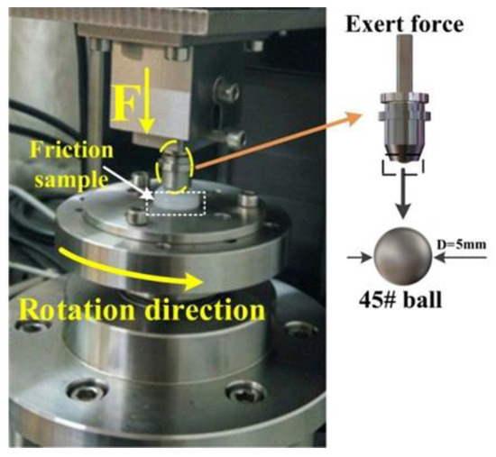 The experiments were conducted at room temperature 20 °C and 35% relative humidity. Before the test, in order to reduce the influence of refined grain abrasion, 800# metallographic sandpaper was used to polish the surface of the steel ball and the samples. The test sample was fixed on the bottom chassis of the CFT-I multifunctional material surface comprehensive performance tester (Lanzhou Zhongke Kaihua Technology Development Co, Ltd., Lanzhou, China), which would record 90 data per minute and draw the friction coefficient curve on the LCD screen, and the steel ball was mounted on the tester arm, as shown in Figure 1. The UHMWPE/steel ball friction wear test began when the sample remained stationary and the friction pairs slid against each other, and the rotating diameter was 5 mm. Unsaturated lubrication was applied by dropping water or brine onto the sliding surface at a flow rate of 55–60 drops per minute (about 150–170 mL/h).