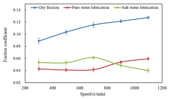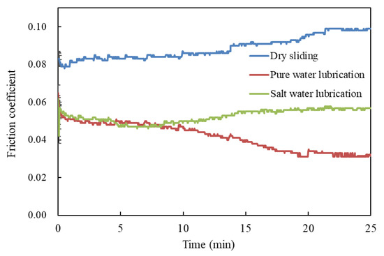 After sliding for about 20 min, under lubrication of water and brine, the friction coefficient reached steady state as the water absorption rate of UHMWPE surface entered steady state, and the friction coefficient of the dry condition reached steady state after sliding for about 22 min due to the stability of the transfer film, which strongly depended on time and temperature [17]. Under other pressures and speeds, the friction coefficient could reach a stable state within 25 min. Therefore, the friction coefficient values in this paper were recorded after 25 min of the test.
