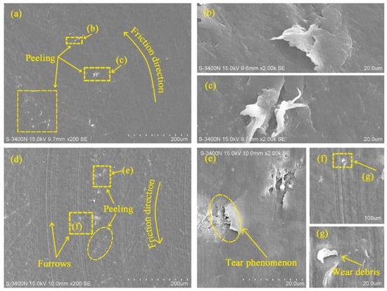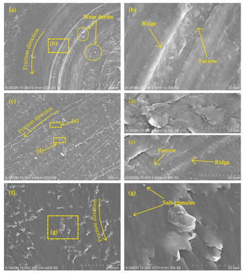 SEM micrographs of worn surfaces of UHMWPE at 1100 r/min speed (a) dry friction, (c) water-unsaturated lubrication and (f) brine-unsaturated lubrication; (b,d–e,g) are the images taken at the marked positions in the micrographs.