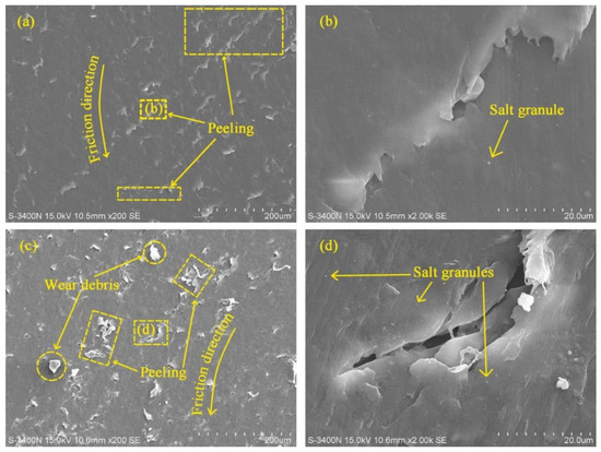 Under unsaturated lubrication, the wear rate in brine was lower than that in water at high speed, which was exactly the opposite of the saturated lubrication [11]. It was mainly due to the fact that water-unsaturated lubrication was close to dry sliding at high speed, while salt granules precipitated from the saltwater during brine-unsaturated lubrication played a ball effect. However, at high load conditions, the salt granules were squeezed into the surface of the sample, and scratches were produced under unsaturated lubrication, resulting in a higher wear rate than that under water-unsaturated lubrication.