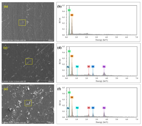 EDS analysis of worn surface of UHMWPE (a) water-unsaturated lubrication with 110 N load, (c) brine-unsaturated lubrication with 50 N load, and (e) brine-unsaturated lubrication with 110 N load; (b,d,f) are EDS spectra of the sample surface labeled in (a,c,e), respectively.