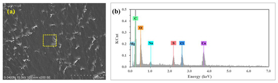 Figure 6 shows SEM micrographs of the worn surface of UHMWPE under brine-unsaturated lubrication at 50 and 110 N loads. In the sample at 50 N load (Figure 6a), very few granules were observed, and there were many peels on the surface of the sample. At 110 N load, there were more granules on the surface of the sample (Figure 6c). Elements Mg, Na, S, Cl and Ca were found in the area where granules appeared under brine-unsaturated lubrication, while these elements were absent under pure water-unsaturated lubrication, as shown in Figure 7, and the count of these elements increased with the increase in load. Therefore, it can be judged that the granules on the surface of UHMWPE are salt particles under brine-unsaturated lubrication.