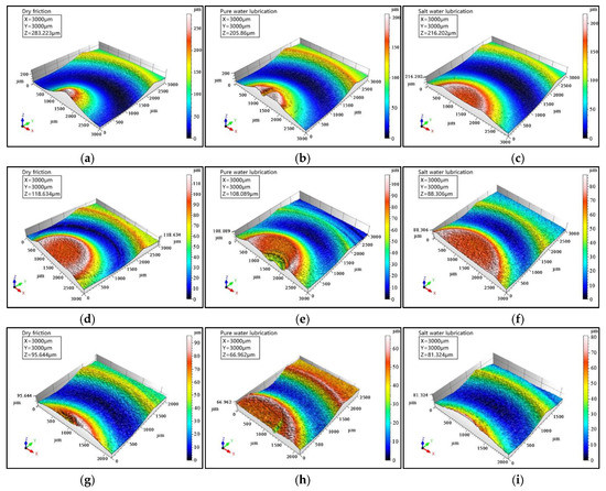 Three-dimensional surface morphologies of UHMWPE under dry friction, water-unsaturated lubrication and saltwater-unsaturated lubrication conditions: (a–c) 110 N load and 500 r/min speed, (d–f) 50 N load and 1100 r/min speed, and (g–i) 50 N load and 500 r/min speed.