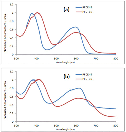 The optical properties of the polymers were measured in dilute chloroform solutions, as seen in Figure 2a, and in thin films. The optical spectra in the solid state are presented in Figure 2b. The results for both PFDENT and PFDTENT are presented in Table 2. All resulting polymers displayed the same absorption pattern in their spectra. It can be seen that UV-vis absorption spectra of the polymers in solid state exhibit two main distinct absorption bands in the region, namely 300–410 nm and 460–700 nm. The shorter wavelength absorption peaks correspond to π–π̽ transitions of the conjugated structure of polymers. Meanwhile, the absorption bands at longer wavelengths can be attributed to ICT bands between the donor and acceptor moieties along the D–A polymer backbones. Dilute solutions of the ethylene-based polymer PFDENT (Figure 2a) displayed ICT absorption bands at 585. When fabricated in films (Figure 2b), the band is red-shifted and observed at 608. The bathochromic shift is mostly attributed to the ordered packing of polymer chains as well as their aggregation in solid state [40,41]. To ascertain the effect of ethynylene units on the optical properties of polymers, a further comparison was conducted between the ethynylene-based polymer PFDENT and its thiophene counterpart PFDTNT [39]. The intensity of the ICT bands of PFDENT is more pronounced relative to its thiophene equivalent polymer, suggesting that the incorporation of acetylene spacers instead of thiophene repeat units next to the NT units reduces the steric hindrance between these and adjacent units and enhances intramolecular charge transfer and π-overlap as well as the planarity of the polymer chains. As a result, the absorption maxima for PFDENT is red-shifted compared to its analogue PFDTNT [39]. This may extend the absorption spectrum of the synthesized polymer, although the presence of acetylene units may localize the π-electron wave function on ethynylene spacers; therefore, this decreases the electronic delocalization between the electron acceptor and the donor segments [25,38].
