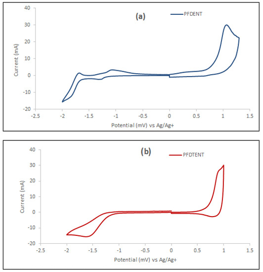 Cyclic voltammograms of (a) PFDENT and (b) PFDTENT.