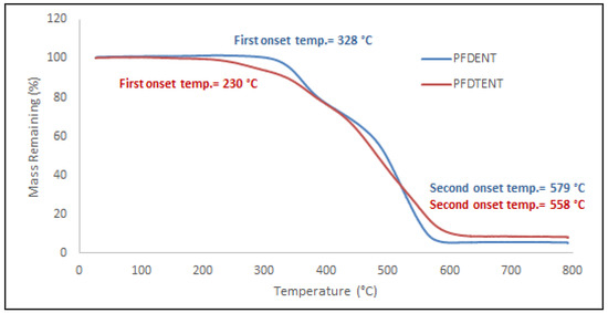 These findings indicate that the thermal stabilities of the ethynylene-based polymer are adequate for its application in solar cells and other electronic devices. It can be noted that the synthesized thiophene-based polymer PFDTNT [39] exhibited a higher decomposition temperature (~400 °C) relative to its ethynylene counterpart PFDENT. It is speculated that the high molecular weight of thiophene-based polymers (PFDTNT) decreases the molecular mobility and promotes chain entanglements, resulting in the increased degradation temperature of polymer. These results are consistent with previous studies that show the relationship between the molecular weight of polymers and degradation kinetics [43].