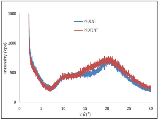 Figure 5 displays powder X-ray diffractions (XRDs) of all the resulting polymers. The XRD profile was studied to examine the molecular packing of polymer chains. PFDENT displayed a broad peak in the wide-angle region at 2θ values of 19.95°, corresponding to a distance of 4.45. This broad peak in this area revealed that the ethynylene-based polymer adopts an amorphous structure in solid states. Generally, the results obtained are consistent with previous results in the literature concerning the effect of ethynylene spacers on the packing of polymer chains [44]. Moreover, it is interesting to compare the XRD studies of the ethynylene-based polymer PFDENT and its thiophene analogue polymer PFDTNT, which were prepared by the Iraqi group [39]. PFDTNT did not show any pronounced diffraction peaks in this wide-angle region compared to PFDENT. It is speculated that the incorporation of acetylene units along the main chains of polymer with the same system slightly promote the packing of polymer chains by improving the coplanar interactions owing to a decreased torsion angle between the electron donor and acceptor moieties.