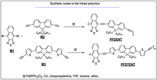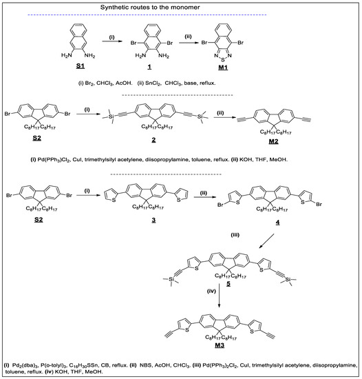 The general synthetic routes to prepare the intermediate monomers M1–M3 are outlined in Scheme 1. The key monomer M1 was synthesized from 2,3-diaminonaphthalene (S1) by bromination with bromine using acetic acid to obtain the corresponding dibromo compound 1, followed by ring closure using excess thionyl chloride in basic conditions, generating M1 in a yield of 49% after recrystallization from ethanol. Moreover, the final monomer M2 (9,9-dioctyl-2,7-diethynylfluorene) was synthesized from 9,9-dioctyl-2,7-dibromofluorene (S2) as starting material. This monomer requires to be kept at low temperature and in the dark before use. The first step in the monomer synthesis was a functionalization of the 2,7 positions of fluorene with trimethylsilyl acetylene using a Sonogashira reaction, which resulted in compound (2) (9,9-dioctyl-2,7-[bis(2′-trimethysilyl)ethynyl)]fluorene) in a yield of 85.4%. The reaction was carried out in the presence of Pd and CuI as the catalysts with diisopropylamine/(THF, toluene) as the reaction media under an inert atmosphere. The procedure is well established in the literature [31]. The final monomer M3 can be obtained in four steps following the modified procedures [34,35]. The first step requires the use of a Stille reaction between 2-(tributylstannyl) thiophene and 2,7-dibromo-9,9-dioctylfluorene (S2) to obtain 2,7-dithienyl-9,9-dioctylfluorene (3). The reaction was carried out in chlorobenzene at 120 °C overnight using Pd2(dba)3and tri(o-tolyl)phosphine as a catalyst. In this reaction, a high boiling point solvent helps the reaction to proceed to completion. The reaction was high yielding (91%) after the purification of the product by column chromatography. The second step is a bromination reaction, and compound (3) was brominated at the 5,5 positions of thiophene units using NBS in a CHCl3/AcOH solvent mixture to obtain the desired product of 2,7-bis(5-bromothiophen-2-yl)-9,9-di-n-octylfluorene (4) in a high yield. Using a ratio of NBS, compound (3) of 1.98:1 eliminated concerns about the formation of tri and tetra brominated compounds that are difficult to be separated from the desired product. The following steps involved a Sonogashira reaction of dibromide (4) and trimethylsilyl acetylene using a Pd/Cu catalyst and base to obtain compound (5). The crude product was purified via silica gel column chromatography to obtain the desired product (5) in a high yield (85%). Compound (5) was then treated with a potassium hydroxide solution in THF at room temperature. The resulting deprotected product M3 was extracted with DCM, washed with water and dried to obtain a brown colored product as a final pure monomer.