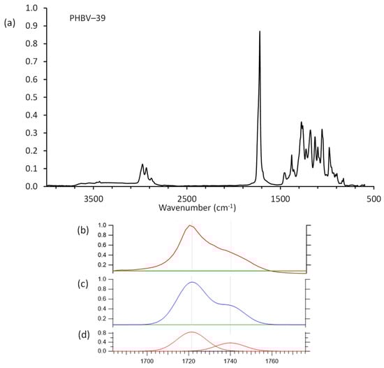 (a) FTIR spectrum for purified PHBV-39 sample; (b) expanded spectrum showing the carbonyl region before fitting; (c) expanded spectrum showing the carbonyl region after fitting; (d) fitted carbonyl bands.