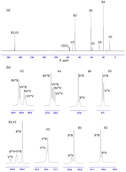 13C-NMR (a) full spectrum; (b) expanded region associating to the splitting of individual resonances of PHBV-61. * denotes linkage between units V and B.