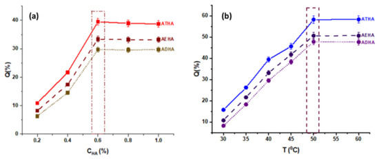 - Increasing the temperature of the reaction medium has the effect of decreasing the viscosity of the reaction medium and increasing the mobility of the polymer chains, leading to a better interaction between the -OH groups belonging to HA and the epoxy groups on the surface of the precursor microparticles, and thus to a higher amount of grafted HA. Temperature is also known to increase the reaction rate and to favor higher yields for most chemical reactions;