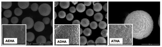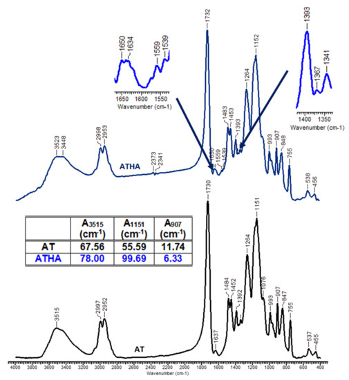 - The values of the specific absorption band areas at the wavenumber 3450 cm−1 are higher for the hybrid microparticles (AAEHA = 46.95 cm−1, AADHA = 28.95 cm−1, AATHA = 78.00 cm−1) compared to the values of similar absorption band areas corresponding to the precursor microparticles (AAE = 20.97 cm−1, AAD = 13.73 cm−1 and AAT = 67.56 cm−1). The higher values of the absorption band of the hybrid microparticles are due to the presence of sodium hyaluronate, which has several hydroxyl groups in its structure;