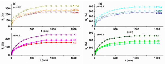 3.4. Swelling Capacity of Precursor/Hybrid Microparticles in Aqueous Media