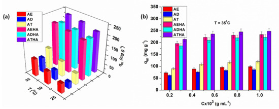 - With increasing temperatures, the saturation capacity increases, indicating a better accessibility to the adsorption centers on the surface of the precursor/hybrid microparticles;