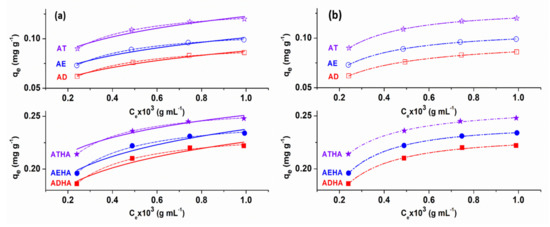 - Khan isotherm [32]:where KS is the Sips constant (L·mg−1); nS is the Sips model exponent; bK is the Khan model constant; and nK is the Khan model exponent.