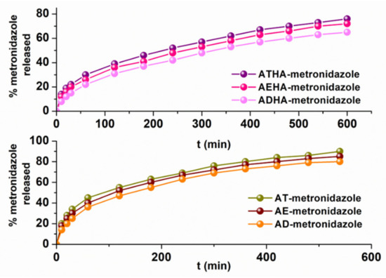 - In the case of hybrid microparticles, the value of n is in the range of 0.57–0.63, indicating that the release mechanism of metronidazole is a complex mechanism, controlled by both diffusion and swelling processes characteristic of an anomalous or non-Fickian diffusion;