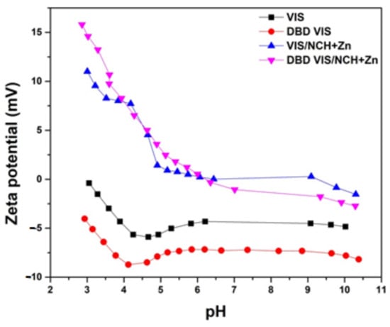 Modification of viscose by using DBD led to changes of its electrokinetic properties, which can be clearly seen in Figure 3; the pH–zeta-potential curve for DBD VIS was phase-shifted to lower zeta potential values in relation to the pH–zeta-potential curve for VIS, and the isoelectric point for DBD VIS was shifted to a lower pH value in relation to the isoelectric point for VIS. These changes indicate a more negative surface charge of DBD VIS due to the presence of deprotonated acidic groups (COO−), making it more suitable for functionalization with NCH+Zn.