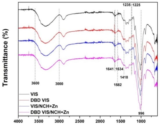 In the FTIR-ATR spectra of NCH+Zn-functionalized viscose fabrics (Figure 4), slight shifts to higher wavenumbers and lower peak intensity of the broad band related to hydrogen-bonded OH groups at 3000–3600 cm−1 can be explained by intermolecular hydrogen bonding between VIS and DBD VIS and NCH+Zn. However, there were no indications of electrostatic interactions of carboxyl groups from VIS and DBD VIS with amino groups and zinc ions from NCH+Zn, nor of covalent interactions of aldehyde groups from VIS and DBD VIS with amino groups from NCH+Zn, which form a Schiff base. The band at 1582 cm−1 [], characteristic for electrostatic interactions, and the band at 1634 cm−1 [], characteristic for covalent interactions by forming a Schiff base, were not noticed and probably were masked by the broad band at 1641 cm−1 [], characteristic for the absorbance of unremovable water bonds to viscose and chitosan [].