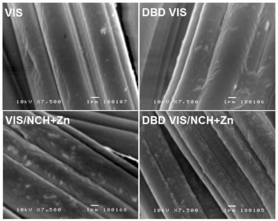 The influences of the surface chemistry and morphology of viscose fabrics modified by DBD plasma on their increased ability to bind NCH+Zn can be also seen in Figure 5. SEM analyses showed that DBD VIS/NCH+Zn fiber surfaces were more densely covered by NCH+Zn than VIS/NCH+Zn fiber surfaces.