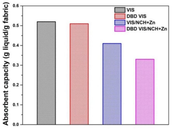 All mentioned changes should affect the sorption properties of functionalized viscose fabrics. Since chitosan is an extremely hydrophilic molecule [], it was expected that the absorbent capacities (defined as the amount of liquid uptake by the fabric in an equilibrium state) of VIS and DBD VIS would become higher after their functionalization with NCH+Zn. However, from Figure 6, it can be seen that the absorbent capacities of VIS and DBD VIS became lower after their functionalization with NCH+Zn. It is likely that NCH+Zn, due to their small dimensions (30 nm), occupy the outer pores/cracks of the viscose fibers in VIS/NCH+Zn and DBD VIS/NCH+Zn. In this way, the possibility of penetration of liquid molecules into the amorphous regions of the viscose fibers covered by NCH+Zn is reduced, and the absorbent capacities of VIS/NCH+Zn and DBD VIS/NCH+Zn become lower. It should be pointed out that NCH+Zn were dispersed in the residual chitosan macromolecules’ solution (they were not centrifuged), which probably led to the formation of a chitosan thin-film-coating on the surfaces of VIS/NCH+Zn and DBD VIS/NCH+Zn fibers. This thin-film-coating on the surfaces of NCH+Zn-functionalized fabrics can also reduce the possibility of penetration of liquid molecules into pores/cracks and amorphous regions of the NCH+Zn-functionalized viscose fabrics, and consequently contribute to the additional decrease in the absorbent capacity of VIS/NCH+Zn and DBD VIS/NCH+Zn.