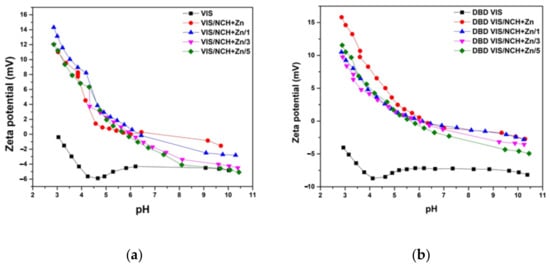 Zeta potentials of unmodified (a) and DBD-modified (b) viscose fabrics before and after functionalization with NCH+Zn. Part of results previously published in [,,].