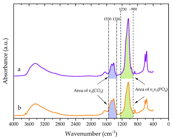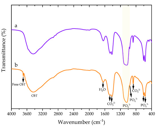 The functional groups of nHAp powder were analyzed by Fourier transform infrared (FT-IR) spectroscopy on Tensor 27 (Bruker, Billerica, MA, USA) with 64 scans and a resolution of 4 cm−1. Each sample was oven-dried at 110 °C for 24 h, mixed with dried potassium bromide (KBr), mashed in an agate mortar and pressed into a disk. Percentage by weight of carbonate content (wt% ) of HAp structure was calculated by Equation (3) [27]: