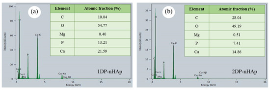 Results from elemental analysis by EDS of nHAp powder (a) 1DP-nHAp and (b) 2DP-nHAp.