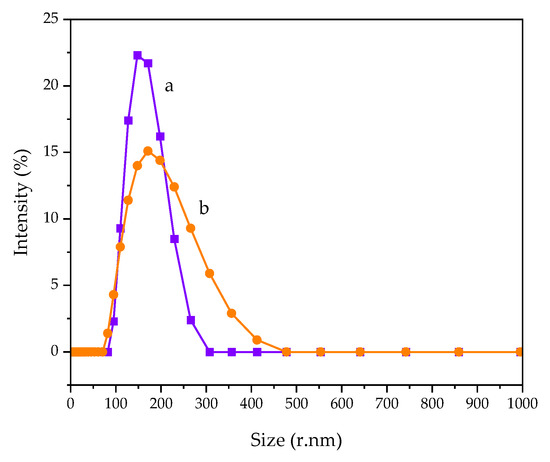 Particle size distribution of 1DP-nHAp and 2DP-nHAp measured by DLS technique is shown in Figure 7. The particle size was reported by Z-average particle size, which is the intensity weighted harmonic mean size. The particle size distribution of both samples is a mono-modal distribution with the Z-average particle size of 223.6 and 172.9 nm, respectively. 1DP-nHAp shows a narrower distribution than 2DP-nHAp. According to Raita et al. [38], the size from the DLS technique is larger than that observed from the electron microscopy because DLS measures a hydrodynamic size, rather than a physical one.