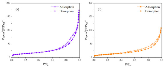 The adsorption–desorption isotherms of 1DP-nHAp and 2DP-nHAp are shown in Figure 8. Both samples demonstrate reversible Type II isotherms which are the physisorption on nonporous adsorbents according to the IUPAC classification. Moreover, their adsorption and desorption lines do not overlap, forming a type H3 hysteresis loop which is found on materials with non-rigid aggregates of plate-like particles [39,40]. Their BET surface area, total pore volume, and mean pore diameter are included in Table 1. 1DP-nHAp has a larger surface area than 2DP-nHAp. For tissue engineering, 1DP-nHAp, the sample with a larger surface area, could interact better with osteoblast cells to promote cell growth and proliferation [1,9].