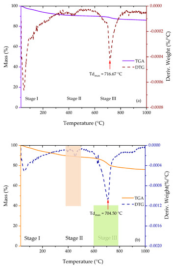 TGA analysis was used to confirm the composition of HAp in 1DP-nHAp and 2DP-nHAp. Figure 9a,b exhibits the TGA results showing the weight loss of 1DP-nHAp and 2DP-nHAp in the temperature range from 30–1000 °C, respectively. The figure also includes their DTG curves, the derivative of the weight loss, which indicate three stages of weight loss from both samples. The first stage at 30–200 °C is the weight loss from water evaporation. The second stage around 375–500 °C corresponds to the weight loss from the combustion of hydrocarbons which are the organic residue. The final stage, at around 600–800 °C corresponds to the loss of carbonate groups in the nHAp structure [19,41]. According to the FT-IR results, 2DP-nHAp has carbonate groups more than 1DP-nHAp. So, the carbonate weight loss of 2DP-nHAp is greater. The HAp residue of 1DP-nHAp and 2DP-nHAp were 86.10 and 76.12 wt%, respectively. In addition, maximum degradation temperature () of 1DP-nHAp and 2DP-nHAp were 716.67 °C and 704.50 °C, respectively. It indicated that 1DP-nHAp has better thermal stability than 2DP-nHAp.