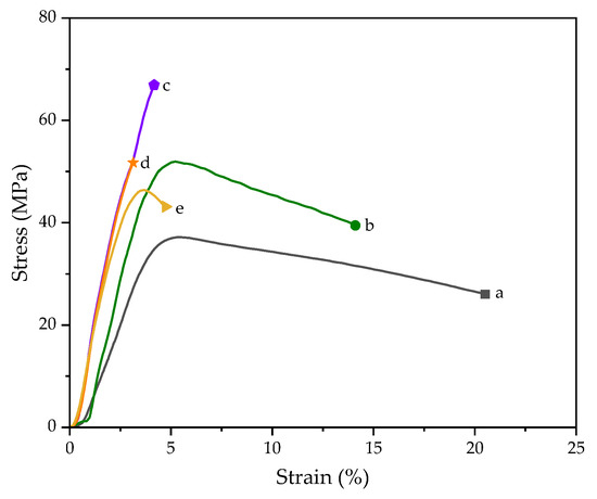 Tensile stress–strain curve of PLA/nHAp composite films with nHAp from different preparation steps and 1DP-nHAp at various contents (a) PLA, (b) PLA/1DP-n, (c) PLA/1DP-n, (d) PLA/2DP-n, and (e) PLA/1DP-n.