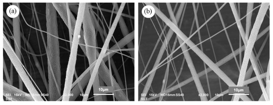 SEM images of PLA/1DP-n composite fibers with applied high voltage at 25 and 30 kV are shown in Figure 12. The continuous PLA/1DP-n composite fibers with rough surfaces without the formation of beads were successfully fabricated. The average diameter of the fibers obtained from the high voltage of 25 and 30 kV is 3.83 ± 1.09 and 2.62 ± 0.35 µm, respectively. The fiber diameter from 30 kV high voltage shows a slightly smaller fiber diameter than that from 25 kV. The increase in the applied voltage leads to the stretching of the polymer chains in correlation with the charge repulsion within the polymer jet [55].