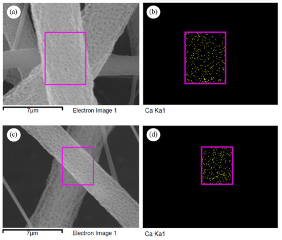 EDS analyzed area and mappings of PLA/1DP-n at 25 and 30 kV high voltage are shown in Figure 13. The EDS analyzed area of each sample was shown by pink frame. The existence of calcium was indicated to nHAp that disperse in fibers. The EDS mappings show a good dispersion of nHAp in both samples. This indicated that nHAp could be incorporated into PLA solution without phase separation and aggregation.