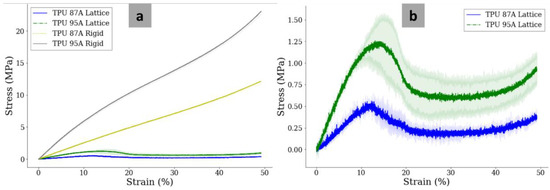 The yield points of the rigid model could not be determined because the compressive tests were stopped when the deformation reached 50% of the total length of the specimens. On the other hand, the yield points of the lattice model could be obtained as shown in Figure 8b. The yield stress of the TPU 87A lattice (0.53 ± 0.10 MPa) was around 43% of the yield stress of the TPU 95A lattice (1.23 ± 0.32 MPa). The yield strains, however, were quite similar. The yield strain of the TPU 87A lattice (10.64 ± 1.92%) was slightly lower than of the TPU 95A lattice (13.75 ± 3.97%).