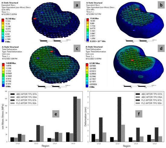 Representative stress profiles of FLC-MTDR (a) and ABC-MTDR (b). Representative deformation profiles of FLC-MTDR (c) and ABC-MTDR (d). Graphs of von Mises stresses (e) and deformations (f) resulting from the FEA.
