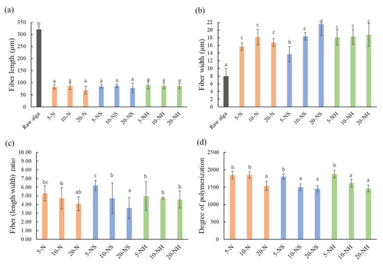 Modification of the Rhizoclonium pulp fiber (a) length, (b) width, (c) ratio of length/width, and (d) degree of polymerization after cooking and beating treatment. Raw material without cooking and beating treatment. Letters indicate a significant difference within each experiment at p < 0.05 in comparison.