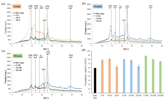 XRD spectra of the (a) N group, (b) NS group, and (c) NH group Rhizoclonium pulp samples, and (d) the CI% of the Rhizoclonium pulp.