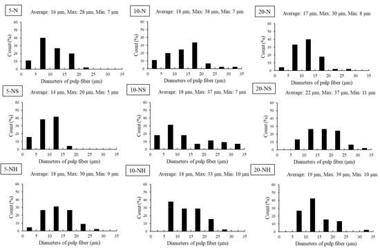 The above 9 types of pulp were made into handsheets to analyze the paper’s morphology, chemical, and physical properties. The morphology of a handsheet is shown in the SEM images (Figure 4). The higher solvent concentration resulted in flatter fibers on the surface of the handsheet, and the three-dimensional characteristics of the fibers were less obvious. Among the N, NS, and NH groups, the fibers of the NS group were the flattest, particularly in the 20-NS group, in which the fibers had almost lost their three-dimensional configuration and the web-like structure associated with previous studies of the Rhizoclonium cellulose structure [9]. The diameters of 5-N, 10-N, and 20-N were less than 20 μm; the diameter of 5-NS was less than 15 μm; and the diameters of 5-NH, 10-NH, and 20-NH were between 5 and 20 μm. However, the diameters of 10-NS and 20-NS were wider and ranged from 0 to 35 μm (Figure 5). The basis weights of the 9 handsheet types were between 33.4 and 35.6 g/m2. The mechanical property analysis showed that the tensile, tear, and burst index values decreased with higher alkali solvent concentrations. Using the same alkali solvent concentration, the tensile, tear, and burst index values of the NH group were greater compared with the N group. In contrast, the NS group had the worst mechanical properties (Figure 6). This may have been associated with the large difference and wide distribution of the fiber diameters in the NS group (Figure 5), which resulted in an uneven support force of the web-like structure and low mechanical strength [48]. In addition, the lower crystallinity of the NS group might also result in low mechanical strength (Figure 3).
