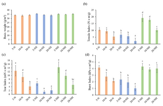 (a) Basic weights, (b) tensile index, (c) tear index and (d) burst index of Rhizoclonium pulp samples under different cooking treatments in handsheets. Letters indicate a significant difference within each experiment at p < 0.05 in comparison.